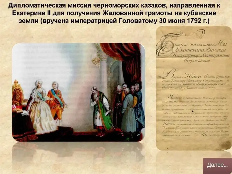Для защиты от внешних врагов и для освоения территории Кубани, царское правительство решило заселить эти земли казаками. Грамотой от 30 июня 1792 года императрица Екатерина