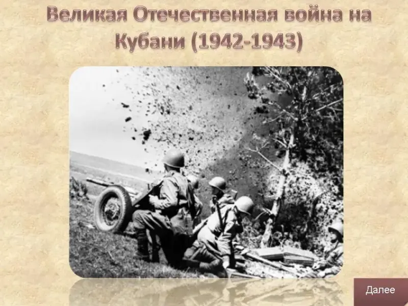 Великая Отечественная война. К июлю 1942 г., когда война пришла на землю Кубани, каждый пятый житель края ушел на фронт. Осенью 1942 немецкие войска заняли большую
