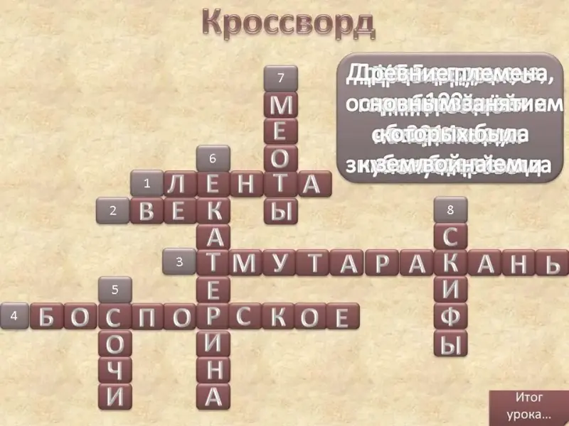 (Слайд 25) Переход с 8 слайда на 25 по управляющей кнопке) Закрепим наши знания с помощью кроссворда. Вопросы: 1.Схема для отображения исторических событий 2.100 лет 3.Древнерусское княжество на Таманском полуострове 4.Греческие города-колонии объединились в это царство 5. Город, где пройдет в 2014 году олимпиада 6. Имя царицы, даровавшей казакам кубанские земли 7.Древние племена, занимавшиеся в основном земледелием 8.Древние племена, основным занятие которых была война |