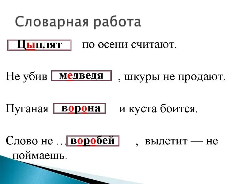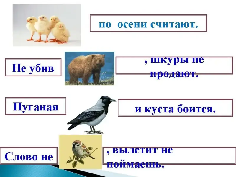 Чтение пословиц (Слайд №4) Цыплят по осени считают. По осени (осенью). Не все цыплята, появившиеся на свет летом, доживают в крестьянских хозяйствах до осени. Кого-то унесут хищные птицы, слабые просто не выживут, поэтому и говорят, что считать цыплят нужно осенью, когда ясно, сколько их сохранилось, выжило. Судить о чём-либо надо по конечным результатам. Преждевременно выражать радость от возможного успеха, если до окончательных результатов ещё далеко и многое может измениться. |