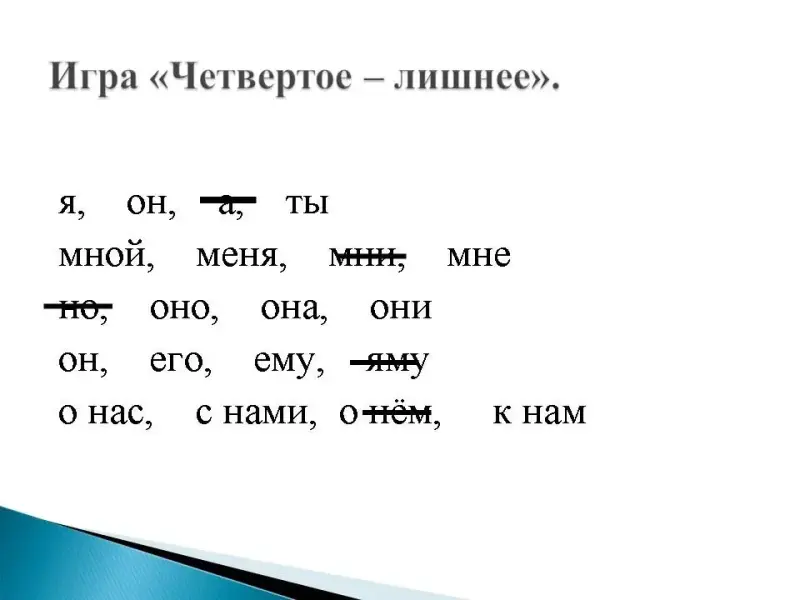 На доске записаны местоимения и другие слова. В каждом ряду убери лишнее слово, докажи, что оно лишнее.