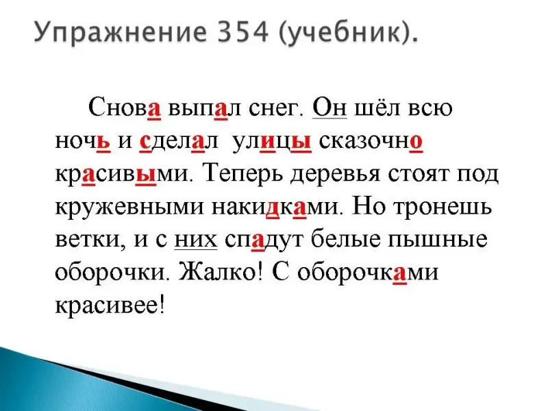 Слайд №23 Снова (наречие с окна) выпал (падает) снег. Он шёл всю ночь (сущ. ж.р.) и сделал улицы (сл.слово, окончание -Ы) сказочно (наречие) красивыми (красный, какими?). Теперь деревья стоят под кружевными накидками (накидочка, сущ., т.п.). Но тронешь ветки, и с них спадут (падают) белые пышные оборочки. Жалко! С оборочками (сущ., т.п.) красивее! |