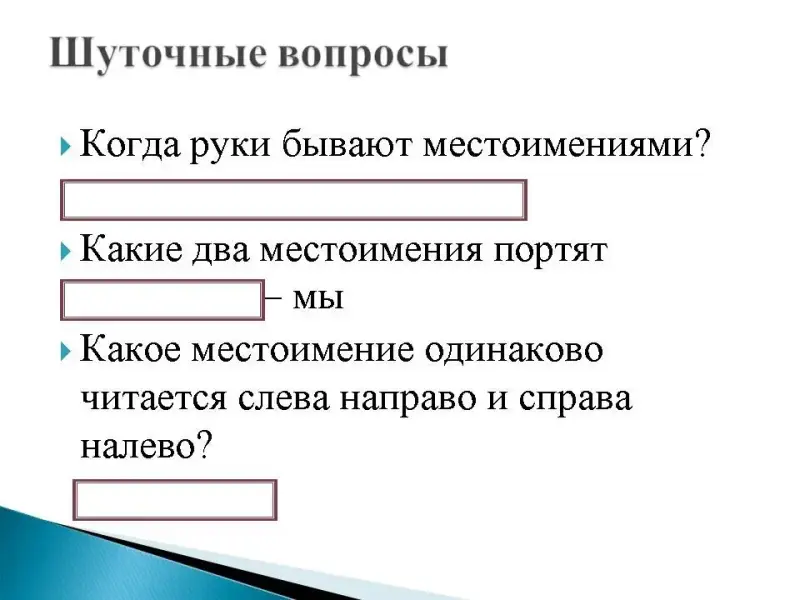 - Когда руки бывают местоимениями? - Какие два местоимения портят дорогу? - Какое местоимение одинаково читается слева направо и справа налево? |