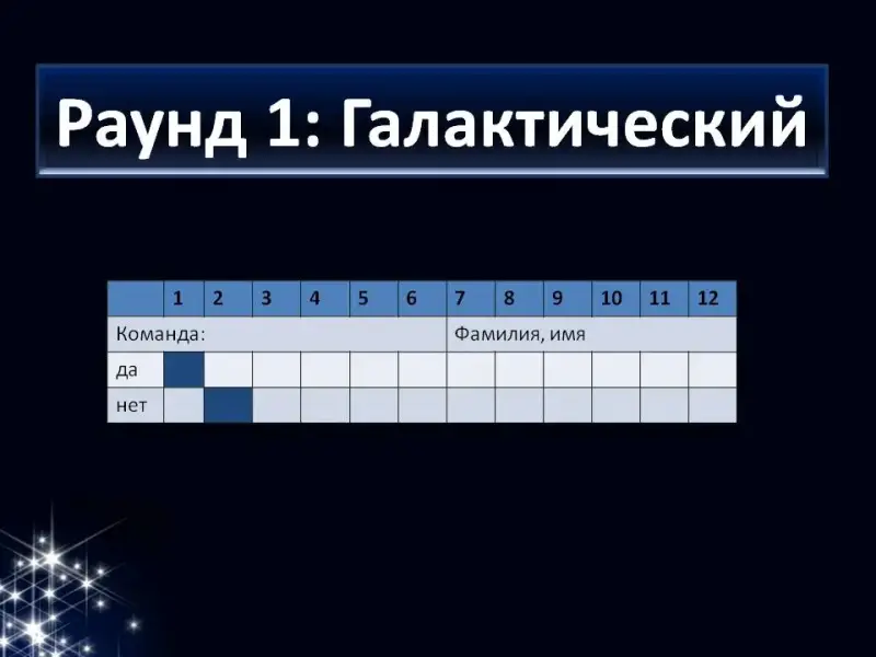 Раунд 1. Галактический. Представляет собой программированный диктант. Максимум 12 баллов (команда получает количество баллов, соответствующее среднему арифметическому от числа баллов, набранных членами команды).