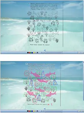 После выполнения задания происходит обсуждение результатов работы, проверка, при необходимости - корректировка. При работе с доской ученики используют инструмент "Выделенный элемент" (для перетаскивания букв в упр. 3), инструменты "Перо" и "Маркер" (для рисования и раскрашивания в упр. 1). |