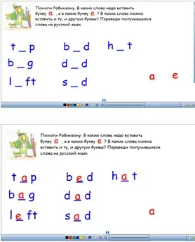 Упражнения, помещенные на слайдах 1 и 2, взяты из Рабочей тетради (РТ) учащихся (Рабочая тетрадь № 1 к учебнику "Happy English.ru" 2 класс, Обнинск, Титул, 2011, стр. 26 упр. 1, стр. 27 упр. 3). В упр. 1 детям предлагается найти одинаковые буквы, написанные на фигурах морских обитателей и выделить их определенными рисунками; в упр. 3 учащиеся заполняют пропуски в словах предложенными буквами.
