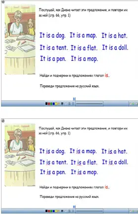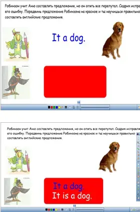 Диана решила помочь Седрику и учит Аню читать английские предложения. Послушай, как Диана читает предложения упр.1 стр. 66 и повтори их за ней. Данное упражнение вынесено на слайд 4, так как далее детям предлагается найти и подчеркнуть в предложениях глагол is, для того, чтобы добиться четкого понимания порядка слов английского предложения. Следующие упражнения, выполняемые учащимися, нацелены на отработку порядка слов в утвердительном английском предложении. В упр. 4 стр.67 предложения представлены в виде гусениц, которым надо прикрепить голову It, а слова-ячейки, из которых состоит тело гусеницы, расположены в строгом порядке относительно друг друга. Внимание детей еще раз привлекается порядку слов. Прикрепите к каждой гусенице голову, составьте предложение, переведите его. Далее учащиеся разбиваются на пары, каждая пара получает карточку с предложениями, в которых есть пропуски, и маленькие фигурки глаголов-дракош. Из этих предложений временно отлучился глагол-дракоша. Верни его на место. Учащиеся продолжают работать в парах. Они получают наборы цветных кружков-"бусин" со словами на них. Слова-бусины в предложении рассыпались. Собери бусы правильно. А теперь давайте немного поиграем. Учащиеся вновь разбиваются на пары и работают с упр.7 стр. 68 учебника. В упражнении содержатся 8 предложений и восемь картинок, соответствующих предложениям, но расположенных в другом порядке. |