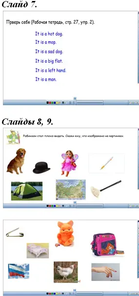 Дети должны расставить слова в правильном порядке так, чтобы получилось предложение. После выполнения задания учащиеся проверяют правильность выполнения с помощью слайда 7. Учащиеся по очереди называют картинки полными предложениями. |