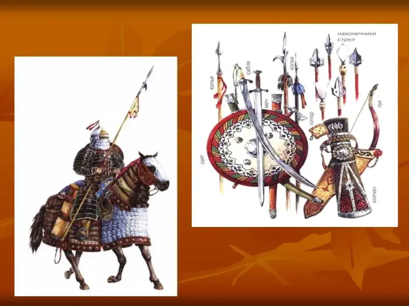 - Рассмотрите рисунок воинов: русских и монгольских. Сравните их (слайды 29-30). (Русские войны одеты в кольчуги, состоящие из металлических колец. Из оружия у них: копье и