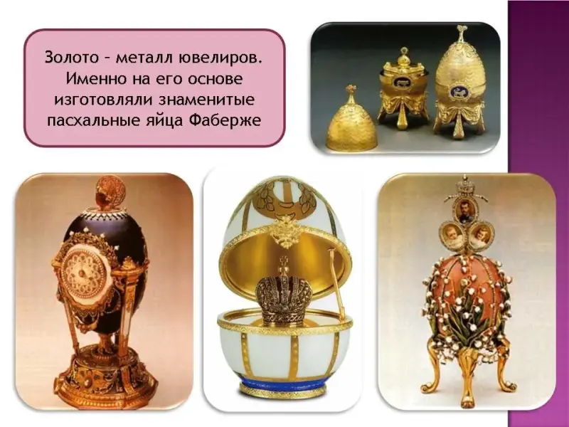 | Е) цвет металлов | По цвету различают металлы черные и цветные. Среди последних выделяют драгоценные - Au, Ag, Pt. Золото - металл ювелиров. Именно на его основе изготовляли знаменитые пасхальные яйца Фаберже | ||||||||||||||||