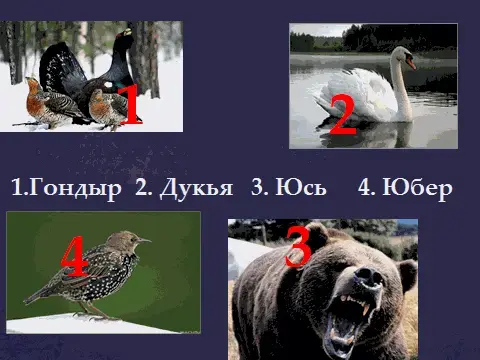 Ответ: цифра 1-это глухарь-цифра 2 - дукья., Цифра 2 -это лебедь и цифра 3- юсь. Цифра 3 -это медведь и правильная цифра ответа - 1-гондыр. Цифра 4 это скворец и правильная цифра ответа 4- юбер.