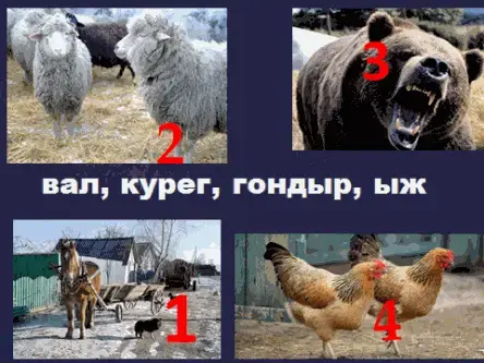 21. А теперь внимание на экран. Слайд № 18. Перед нами животное и птицы и соответственно им поставлены номера красным 1, 2, 3, 4 и они есть в листе эксперта.. Назовите их по-удмуртски, поставив рядом цифру ответа.