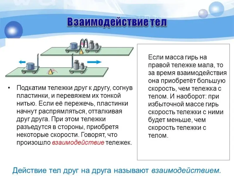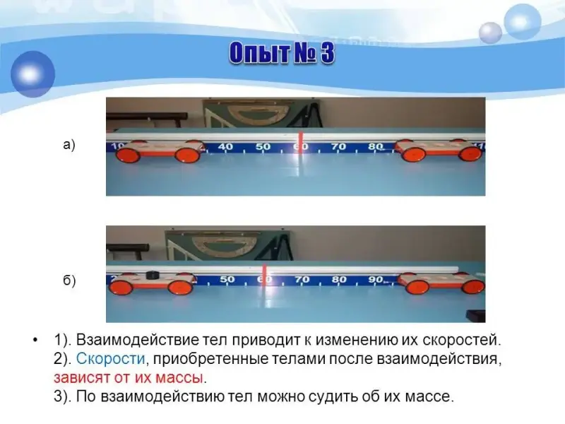 | 2. Мотивационный. | ЭОР № 1. | Демонстрация опыта с двумя тележками, показывающая, что в результате взаимодействия скорости тел изменяются, и у разных тел они изменяются по-разному. | Наблюдают, обсуждают, сравнивают результаты и делают выводы. | 3 |