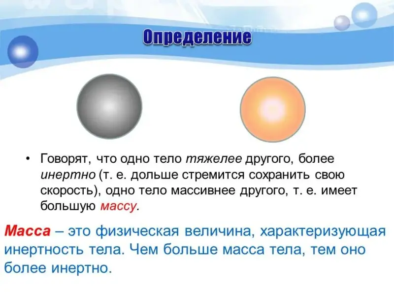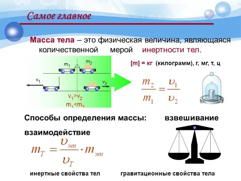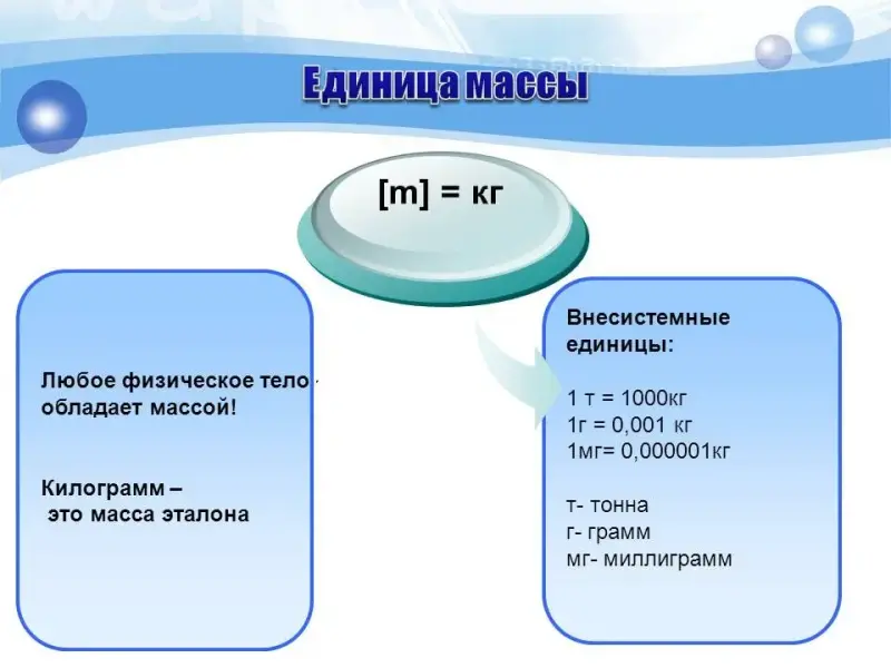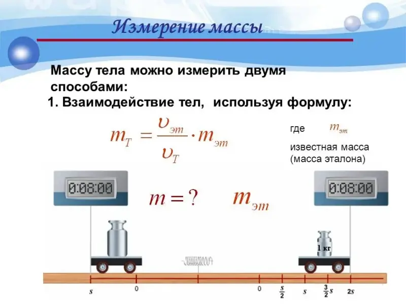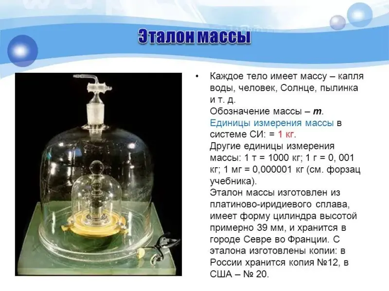 Демонстрация мультимедийной презентации: введение понятия массы, как меры инертности, название основной единицы измерения массы, объяснение, что такое эталон массы. | Составление краткого опорного конспекта. | 15 |