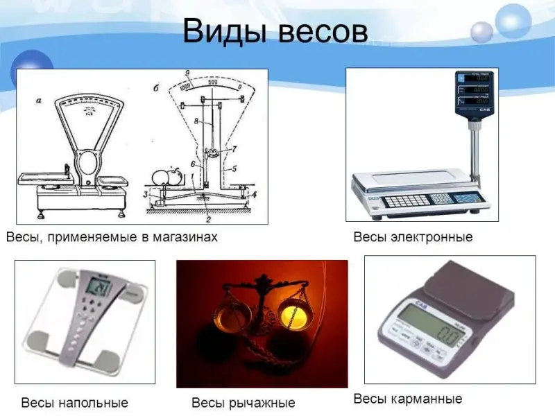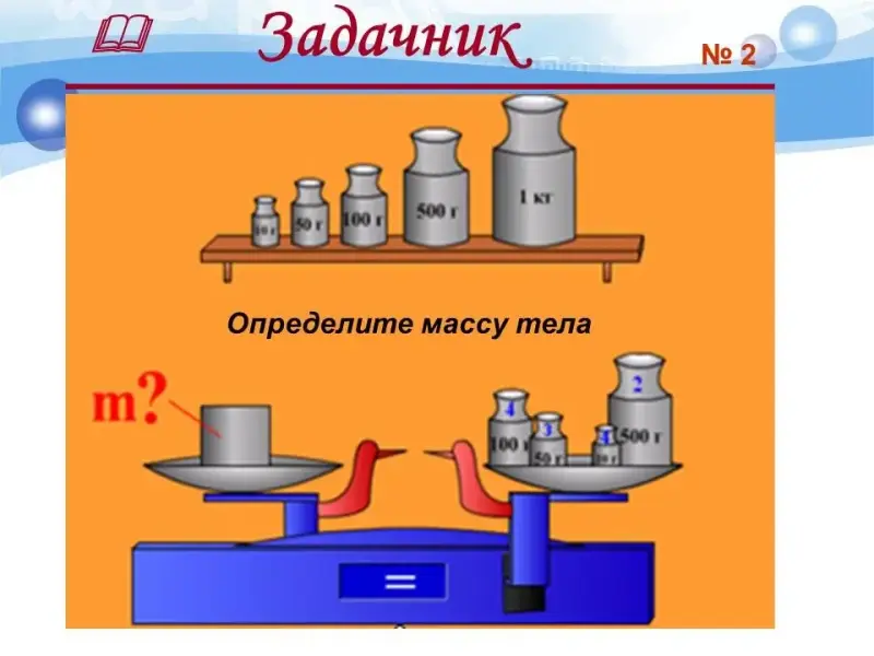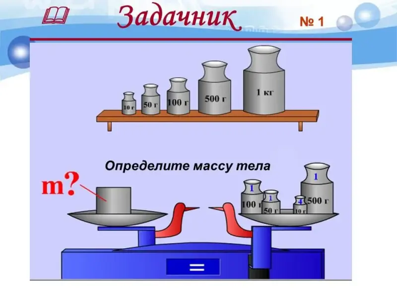 - Демонстрационные весы, наборы гирь разной массы.