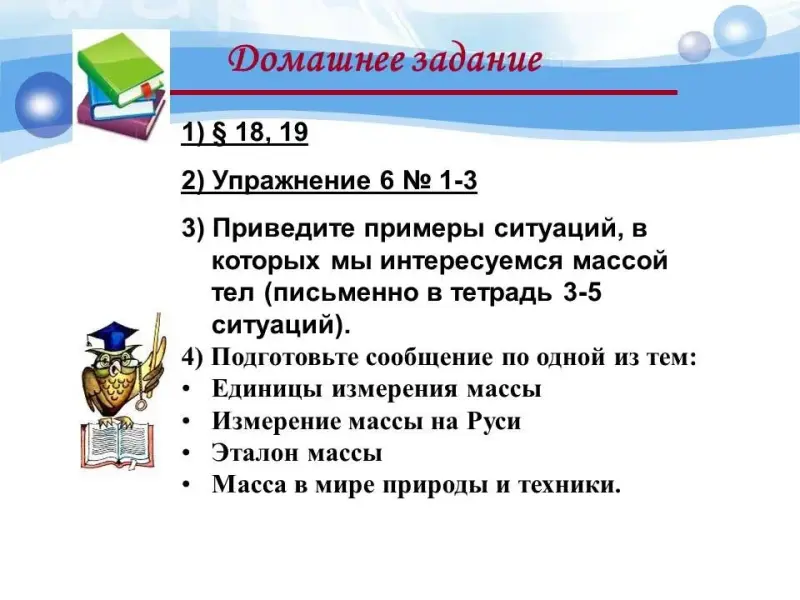 Запись домашнего задания: §19,20, упр.6 (1,3) и темы урока: "Масса тела. Единицы массы. Измерение массы тела". |