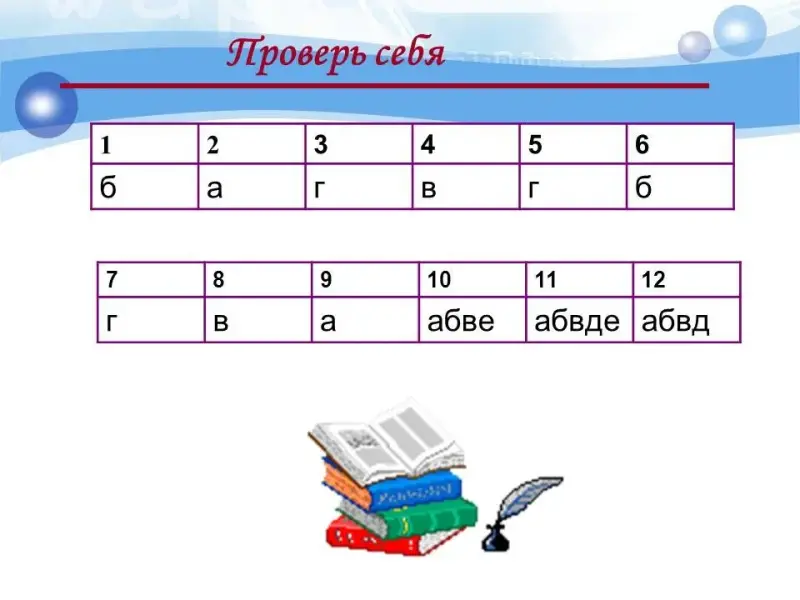 | 5. Закрепление и контроль знаний. | ЭОР № 6. | Контролирует выполнение теста. | Выполняют тестовую работу. | 10 |