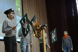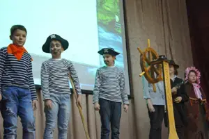 То же можно сказать и о материалах пьесы, где главный герой - ребенок. Близость и понятность представленного в пьесе сюжета и персонажей, специальные костюмы и декорации позволяют учащимся подходить к инсценировке не только как к обязательной части учебного процесса, но и с точки зрения своих личных интересов, что позволяет усилить дидактический и обучающий эффекты. Оригинальный авторский текст адаптирован для учащихся средней школы и рассчитан на выступление продолжительностью 10 минут. В ходе постановки исполняются фрагменты из следующих композиций: "Fifteen Men on a Dead Man's Chest", "With a Little Bit of Luck" из к\ф "My Fairy Lady" и "Boney M" "Hooray! Hooray!".