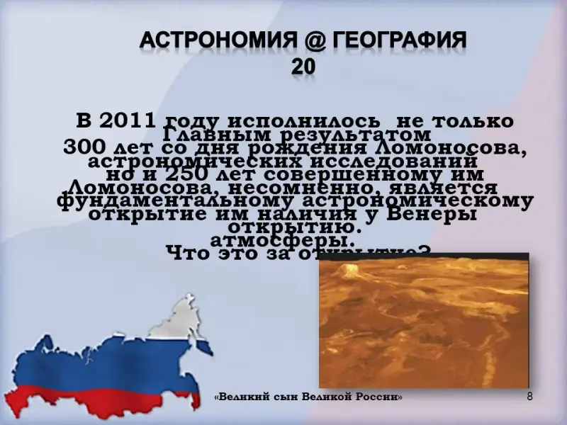 Главным результатом астрономических исследований Ломоносова, несомненно, является открытие им наличия у Венеры атмосферы.