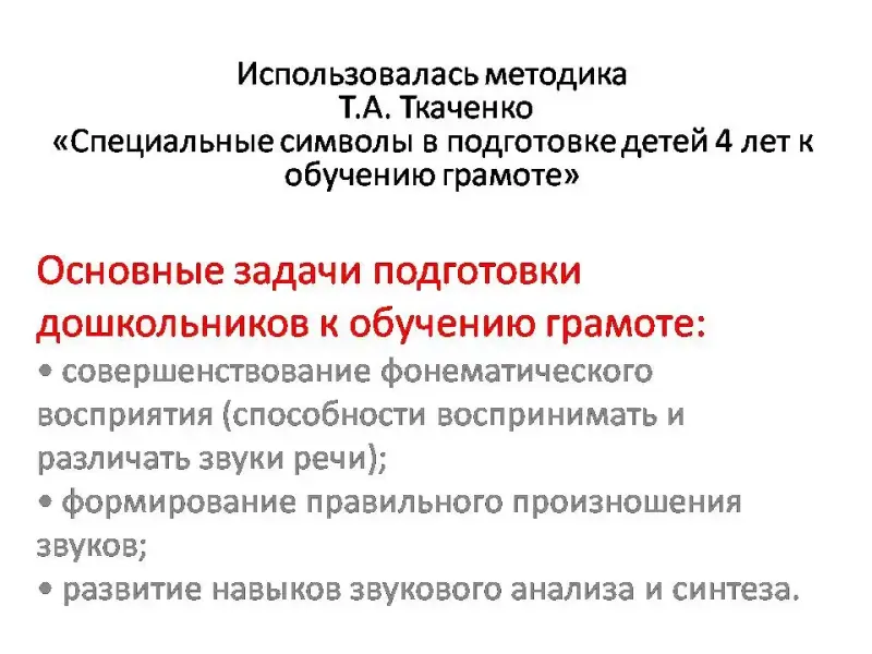 Фонематическое восприятие, произношение звуков и звуковой анализ и синтез, -являются основополагающими процессами для подготовки к обучению грамоте дошкольника, они взаимосвязаны и взаимообусловлены. В своей практической работе с детьми с нарушением речи в течении многих лет я использовала методику Т.А. Ткаченко «Специальные символы в подготовке детей 4 лет к обучению грамоте». Использование этой методики усиливает дифференцировку звуков, моделирует чтение, подготавливает ребёнка к письму. Обучение происходит в интересной игровой форме.