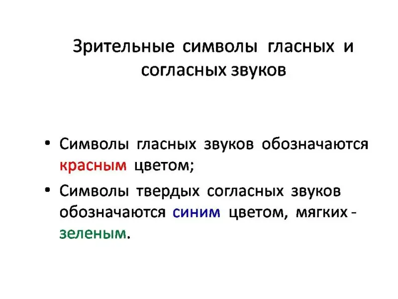 Символы твердых согласных звуков обозначаются синим цветом, мягких - зеленым.