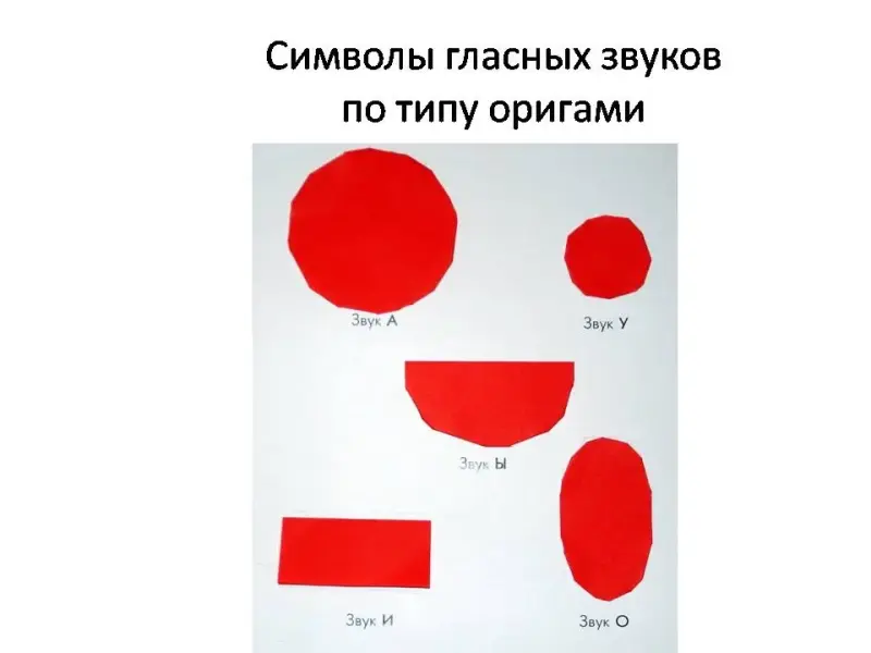 Звук У - обозначается маленьким кружочком, звук А - большим, И - горизонтальной полоской, О - овалом, вытянутым по вертикали, звук Ы - нижней половинкой круга.