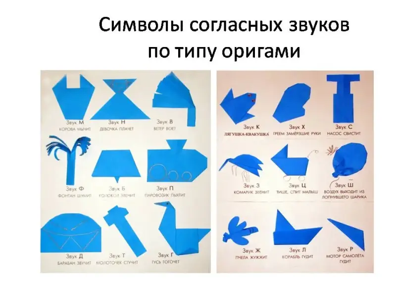 Символы согласных звуков складываются из листа синий бумаги, вызывают у ребят запоминающийся, яркий зрительный образ, который концентрирует, уточняет восприятие соответствующего согласного звука. Кроме того, единство цвета побуждает детей острее реагировать на различие в образах сложенных предметов.