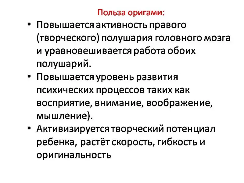 Пластичность детского мозга и минимальное доминирование одного полушария над другим в детстве является очень благоприятной почвой для развития обеих половин мозга и для выработки стратегий взаимодействия полушарий. Занятия оригами помогут ребёнку развиваться, более полно используя ресурсы своей психики.
