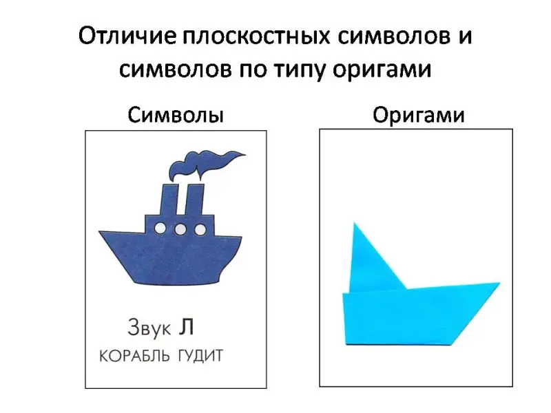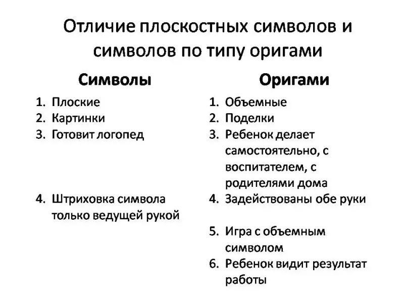 Плоские картинки готовит логопед, Оригами (объемные поделки) ребенок делает самостоятельно с логопедом, с воспитателем, с родителями дома. Штриховка плоского символа выполняется только ведущей рукой. В оригами задействованы обе руки. Ребенок видит результат работы, играя с объемным символом.