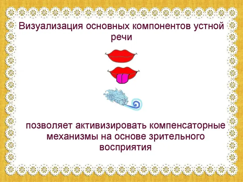 В частности визуализация основных компонентов устной речи в виде доступных для ребенка образов позволяет активизировать компенсаторные механизмы на основе зрительного восприятия. Этому способствует и совместная координированная работа моторного, слухового и зрительного анализаторов при выполнении заданий компьютерной программы. (слайд 5,6)