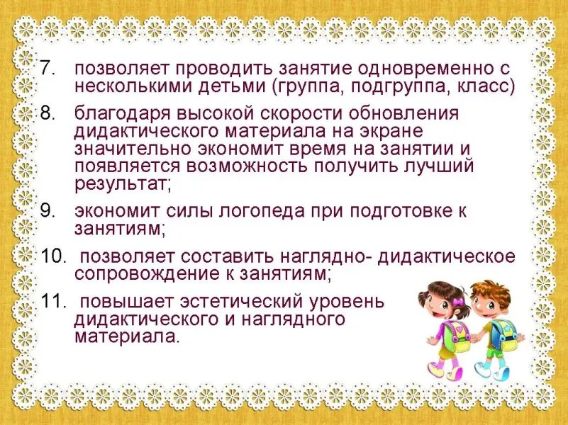 - позволяет проводить занятие одновременно с несколькими детьми (группа, подгруппа, класс)