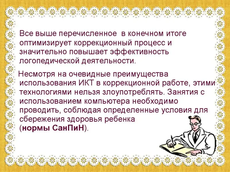 Все выше перечисленное в конечном итоге оптимизирует коррекционный процесс и значительно повышает эффективность логопедической деятельности. Несмотря на очевидные преимущества использования ИКТ в коррекционной работе, этими технологиями нельзя злоупотреблять. Занятия с использованием компьютера необходимо проводить, соблюдая определенные условия для сбережения здоровья ребенка (нормы СанПиН). (слайд 8)