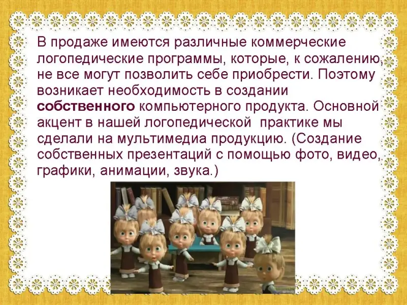 В продаже имеются различные коммерческие логопедические программы, которые, к сожалению, не все могут позволить себе приобрести. Поэтому возникает необходимость в создании собственного компьютерного продукта. Основной акцент в нашей логопедической практике мы сделали на мультимедиа продукцию. (Создание собственных презентаций с помощью фото, видео, графики, анимации, звука.) (слайд 9)