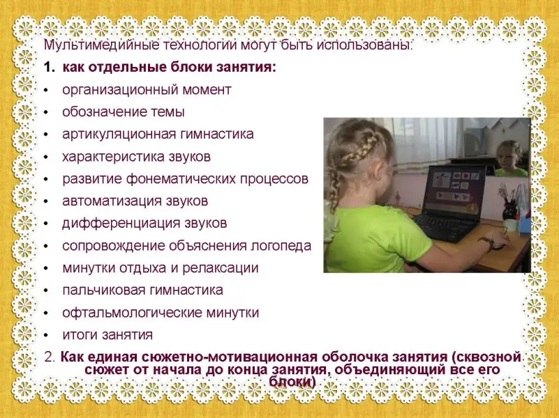 При индивидуальной работе с включением отдельных компьютеризированных блоков занятия используется монитор компьютера, а при работе с сюжетно-мотивационной оболочкой и при занятиях с подгруппой или группой детей - медиапроектор и экран или интерактивная доска.