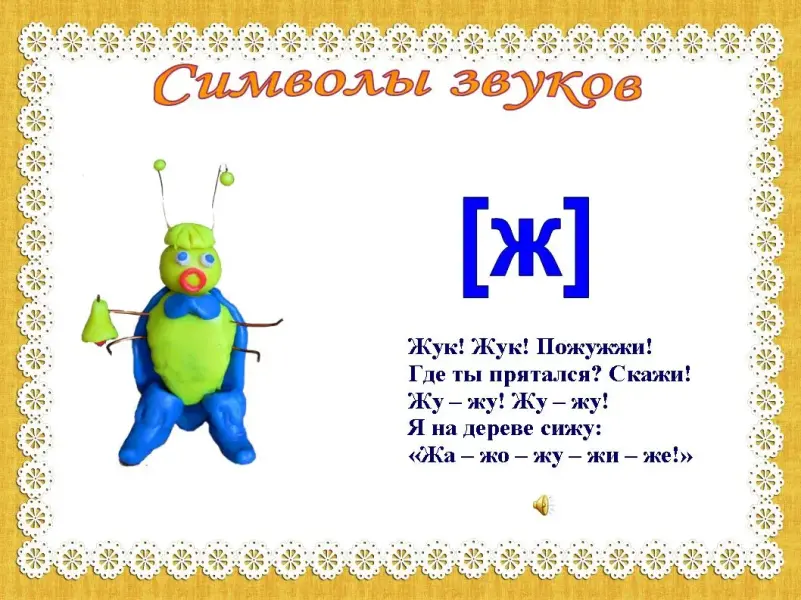 Каждый звук, который мы ставим должен иметь образ - символ, например [ч] - паровозик. Вывод символического героя на экран заметно повысит эффективность занятия, (слайд 15) а если этот герой двигается и поет песенки, как добрый жук - символ звука [ж], то ребенку и самому захочется правильно произносить «трудный» звук. (слайд 16)