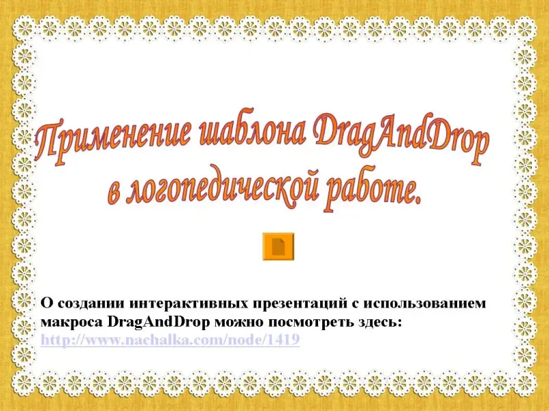 Еще больше возможностей (свободное перемещение по слайду, перемещение с заданной начальной и конечной точкой, увеличение и уменьшение предметов и др.) даёт применение шаблона с макросом DragAndDrop (особенно в сочетании с интерактивной доской). (слайд 25, кнопка гиперссылки на другую презентацию)