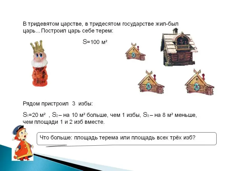 Построил царь терем 100 кв. м, а рядом три избы. Площадь первой избы 20 кв. м, площадь второй избы на 10 кв. м больше, чем площадь первой. Площадь третьей избы на 8 кв. м меньше, чем площади первой и второй изб вместе. Что больше: площадь терема или площадь всех трех изб?