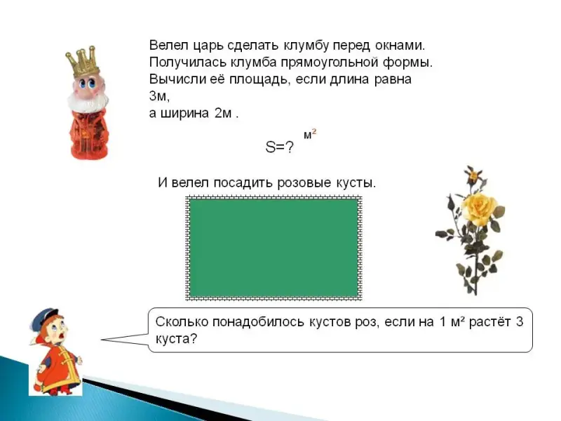 1) Найди площадь клумбы, длина которой 3 кв. м, а ширина - 2 кв. м Сколько потребуется кустов роз, если на 1 кв. м растет 3 куста?