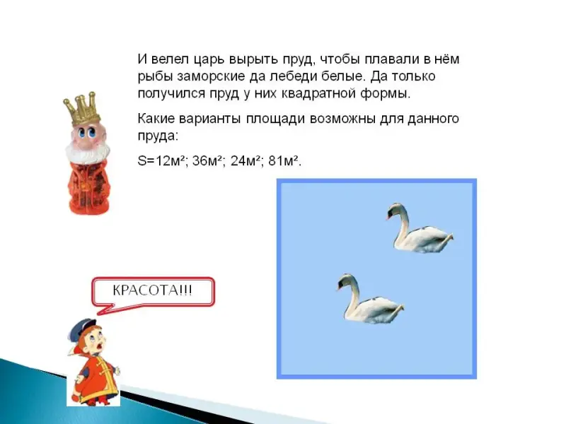 2) Вырыли пруд квадратной формы. Какие варианты площади возможны для данного пруда. 12 кв. м, 36 кв. м, 24 кв. м, 81 кв. м