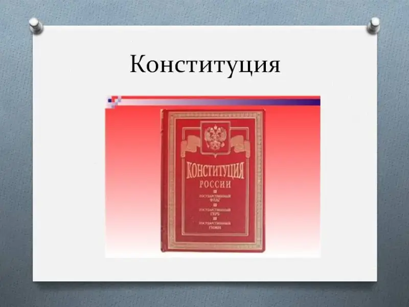 - Мы живём в замечательной стране. Но каждое государство живет по своим законам. И наше государство, тоже живет по своим законам. Слайд 3. (На доске написано слово «закон» и дается его значение). - Что такое закон? Слайд 4. - Все законы записаны в этой книге (показ). Она называется Конституцией Российской Федерации. - В этой конституции записаны наши с вами права. |