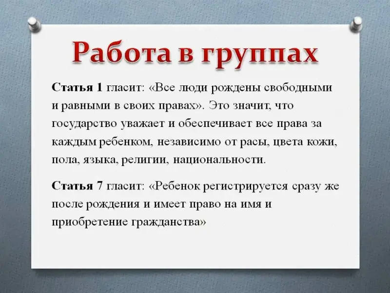 Слайд 6. - Сейчас вы поработаете в группах, ваша задача ответить на вопрос: "О каких правах шла речь в вашем домашнем задании. Когда вы определитесь, ваш представитель подходит к доске, выбирает то, о чём шла речь". 2. Дети подходят к доске, выбирают и прикрепляют к доске: