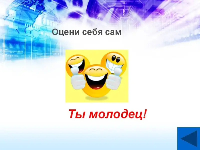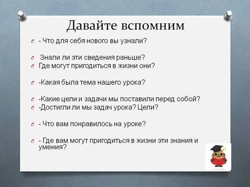 - Знали ли эти сведения раньше? - Где могут пригодиться в жизни они? - Какая была тема нашего урока? - Какие цели и задачи мы поставили перед собой? - Достигли ли мы задач урока? Цели? - Что вам понравилось на уроке? - Где вам могут пригодиться в жизни эти знания и умения? - Ответим на вопрос: - Что приятнее всего? (Достичь желаемого). |