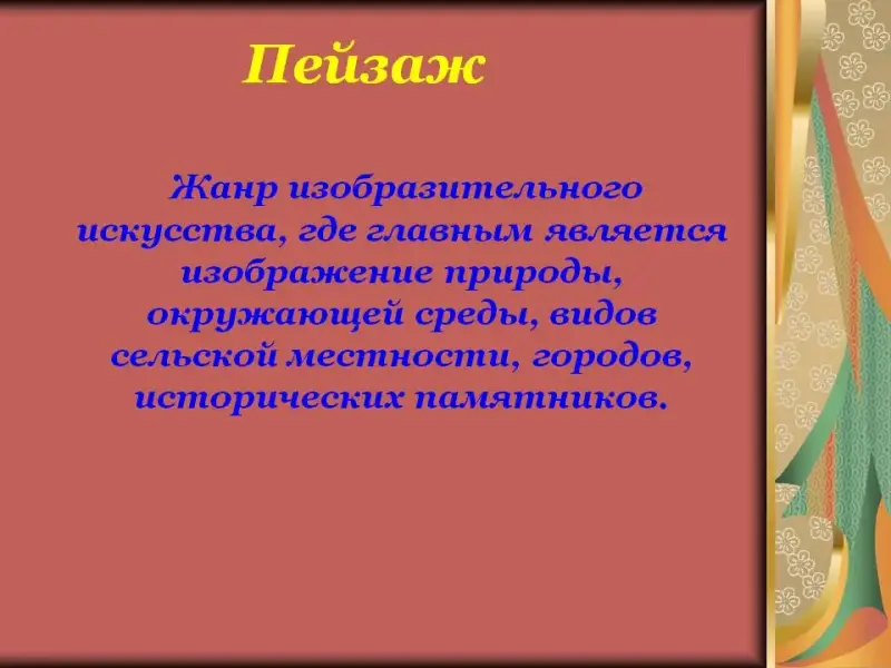 - Жанр изобразительного искусства, где главным является изображение природы, окружающей среды, видов сельской местности, городов, исторических памятников, называется пейзажем.