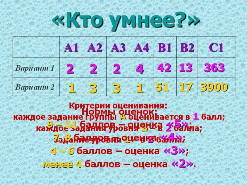 - каждое задания уровня В - в 2 балла;