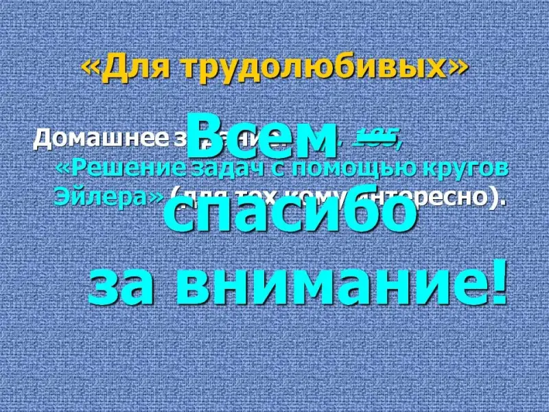 Домашнее задание: стр. 185, (Слайд 7). Решение задач с помощью кругов Эйлера (для тех кому интересно).