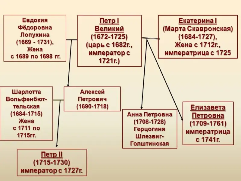 Учитель показывает схему, где изображены жены и дети Петра Великого (Слайд 5) и знакомит учащихся с семьей ПетраI. Ученики, глядя на годы жизни,