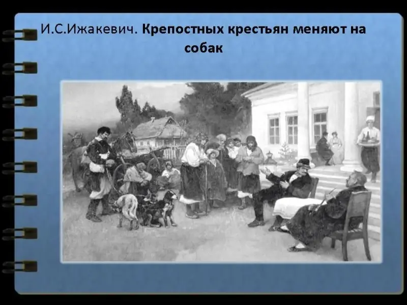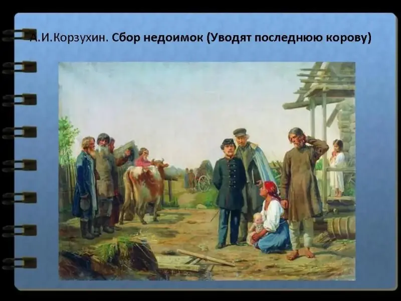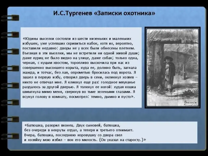 - "Записки охотника" И.С.Тургенев (Слайд 12.) (цикл рассказов Ивана Сергеевича Тургенева, печатавшихся в 1847-1851 году в журнале "Современник". Тургенев показал нам картину увядания России из-за крепостного права. Беззащитные крестьяне составляли огромную долю населения страны. Поэтому Иван Сергеевич обращает наше внимание на то, что произойдет, если помещики и сам император не возьмутся за решение крестьянского вопроса. Вот два отрывка из "Записок охотника, которые дополнят картину крепостной деревни: "Юдины выселки состояли из шести низеньких и маленьких избушек, уже успевших скривиться набок, хотя их, вероятно, поставили недавно: дворы не у всех были обнесены плетнем. Въезжая в эти выселки, мы не встретили ни одной живой души; даже куриц не было видно на улице, даже собак; только одна, черная, с куцым хвостом, торопливо выскочила при нас из совершенно высохшего корыта, куда ее, должно быть, загнала жажда, и тотчас, без лая, опрометью бросилась под ворота. Я зашел в первую избу, отворил дверь в сени, окликнул хозяев - никто не отвечал мне. Я кликнул еще раз: голодное мяуканье раздалось за другой дверью. Я толкнул ее ногой: худая кошка шмыгнула мимо меня, сверкнув во тьме зелеными глазами. Я всунул голову в комнату, посмотрел: темно, дымно и пусто". "Батюшка, разорил вконец. Двух сыновей, батюшка, без очереди в некруты отдал, а теперя и третьего отнимает. Вчера, батюшка, последнюю коровушку со двора свел и хозяйку мою избил - вон его милость. (Он указал на старосту)".