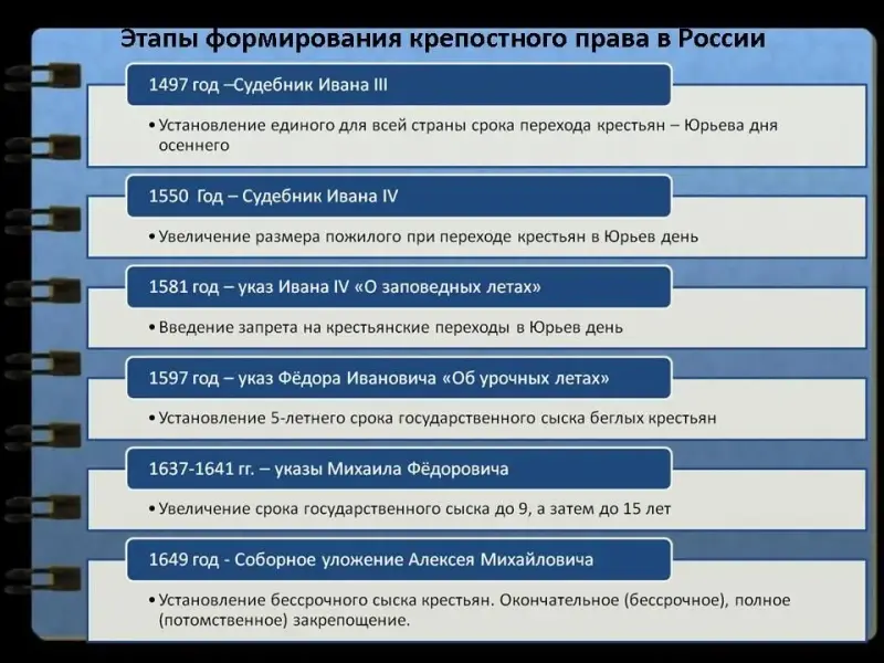 Вспомним этапы формирования крепостного права в России (Слайд 7.) Необходимы комментарии учащихся, уточнение понятий; материал представляет собой сквозное представление процесса закрепощения, поэтому целесообразно записать его в тетрадь.