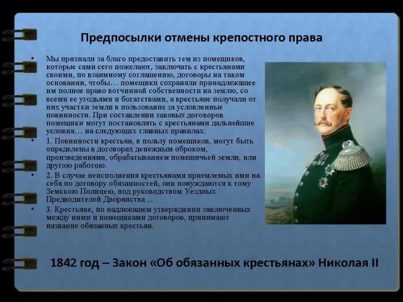 - 1842 год - Закон "Об обязанных крестьянах" Николая II