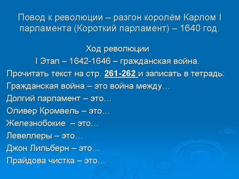 | Учитель объясняет причины Английской буржуазной революции, даёт задание выписать из учебника определения терминов. | Слайд № 7 | Слушают учителя, записывают информацию с экрана интерактивной доски, выписывают определения терминов. |